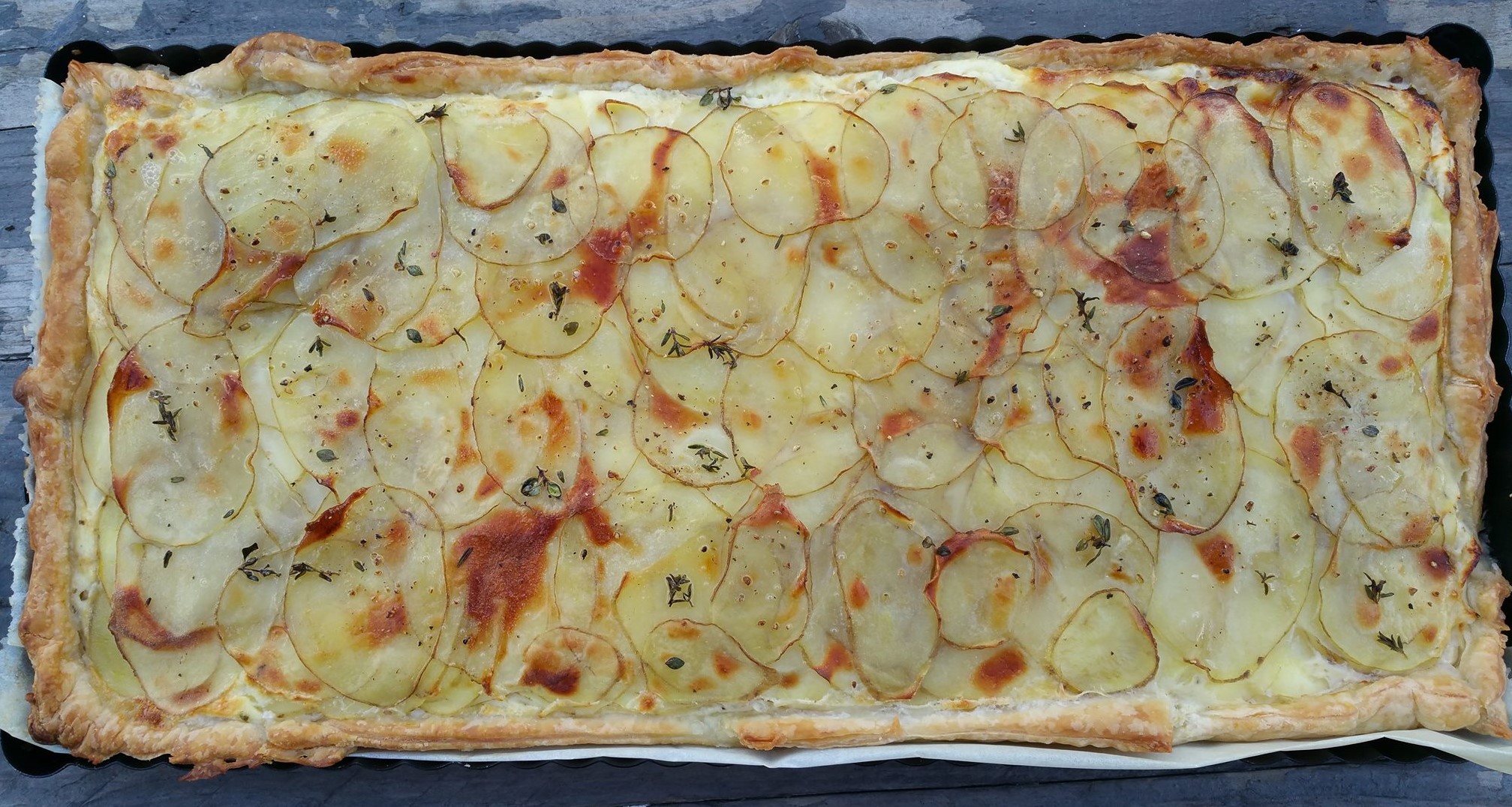 Verdeel de dunne aardappelen schijven erover.