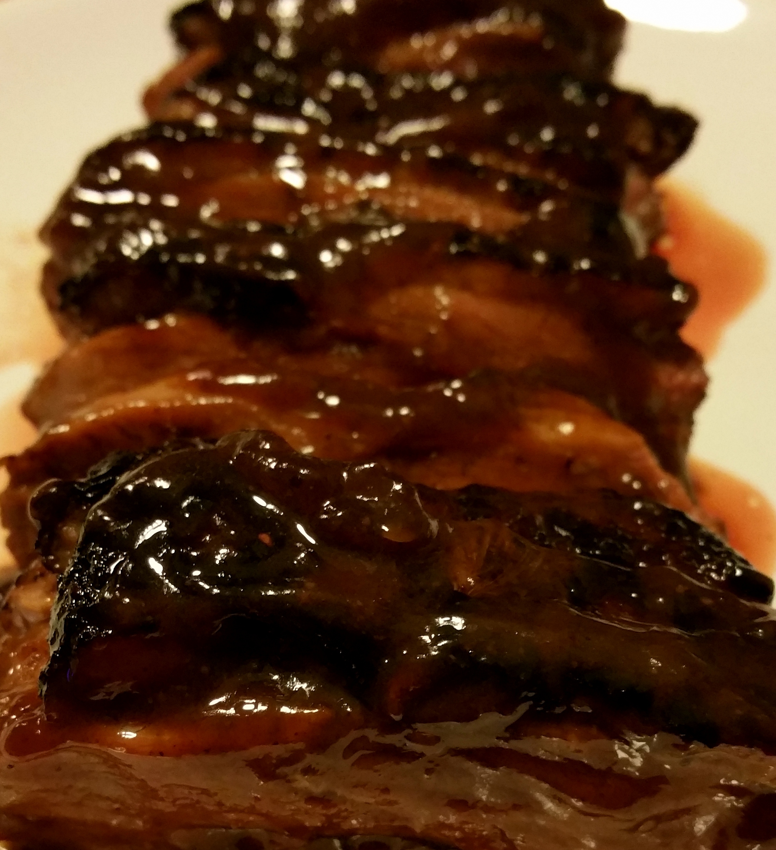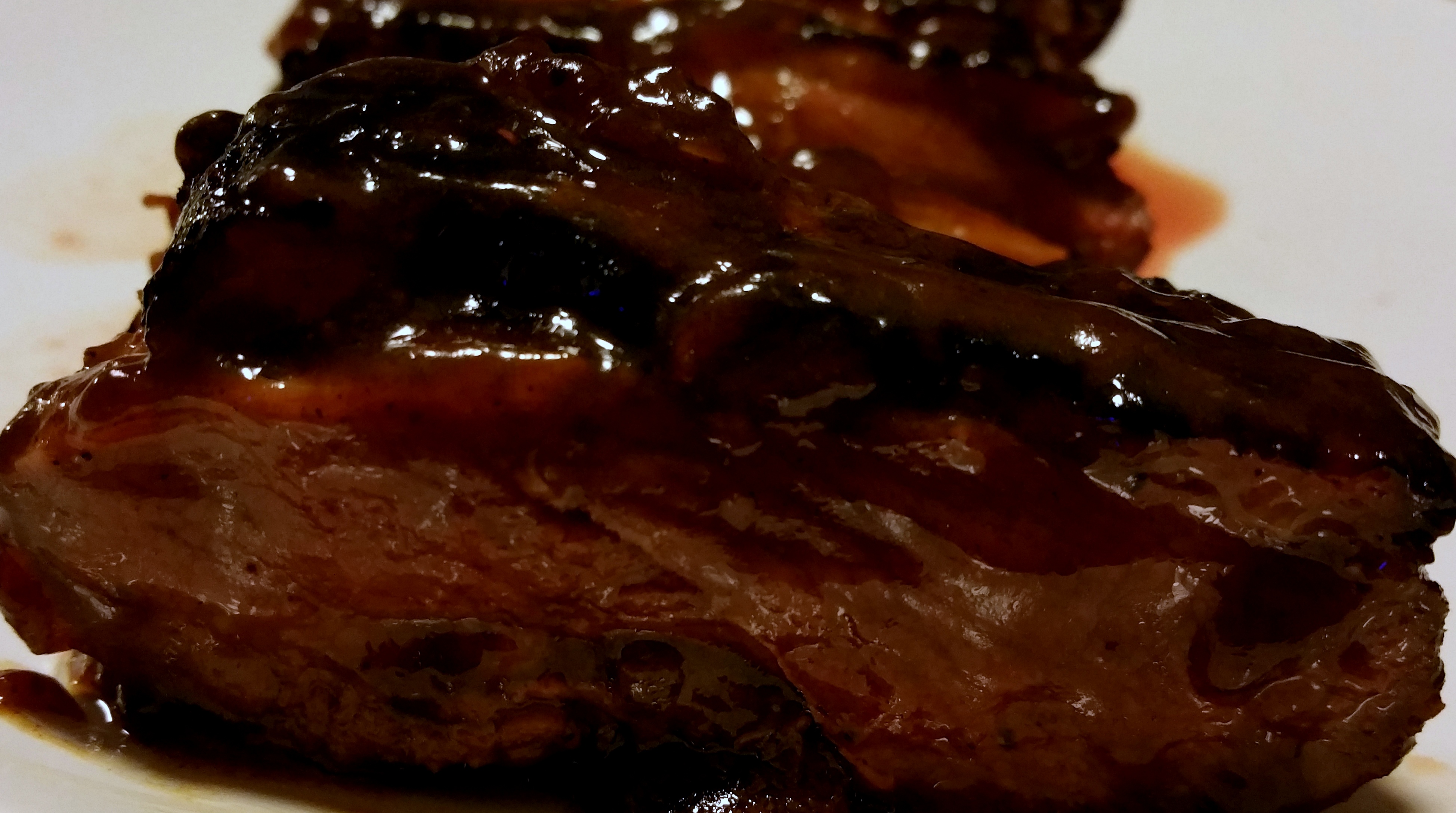 Gemarineerde eendenborsten in een gekruide, zoete saus, gebraden in de oven.