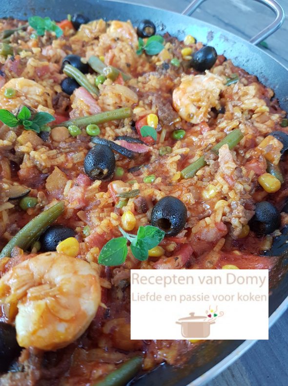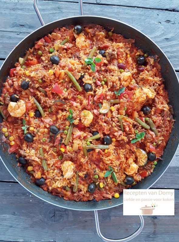 Verwarm 3 eetlepels olie in een grote koekenpan ( ik gebruik mijn paella pan).