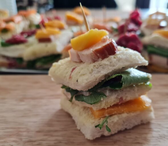 Smeer 3 sneden brood met de honing- mosterd saus.