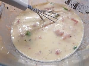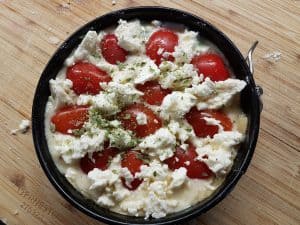 Klop de eieren samen met de kaas, de lente uitjes, de bacon, de yoghurt en de origano en breng op smaak met peper.