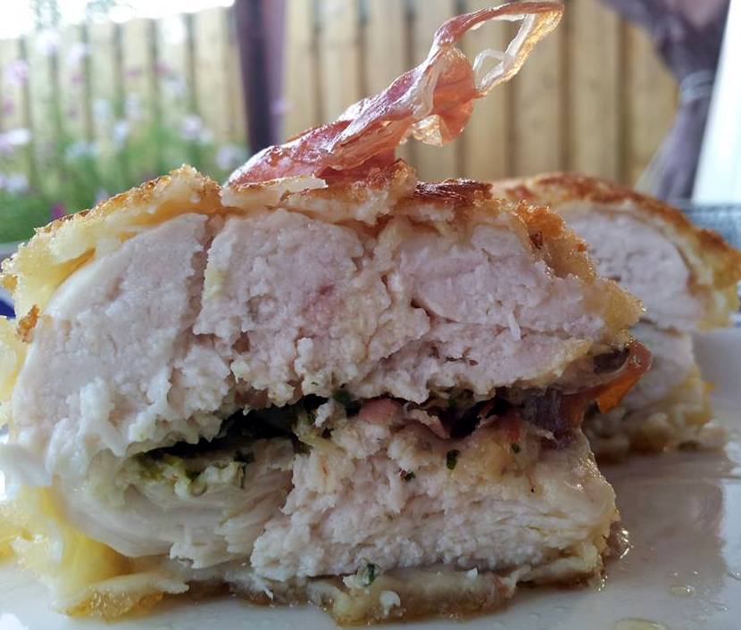Vul de kipfilets met de kruidenboter, de ham en de champignons. Vouw de kipfilets goed dicht.