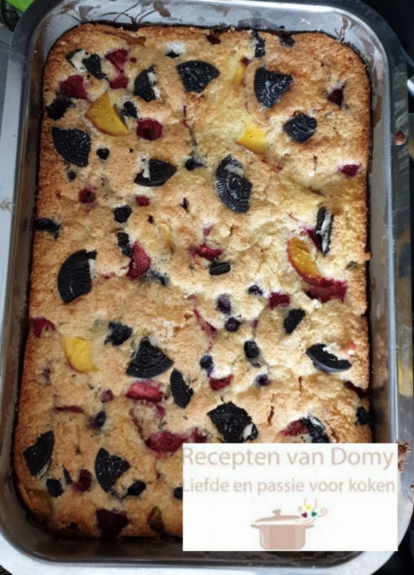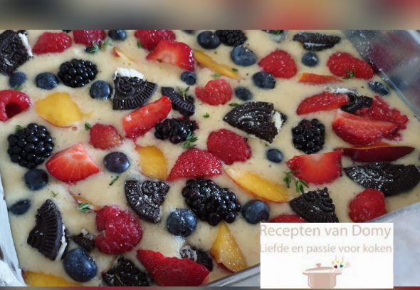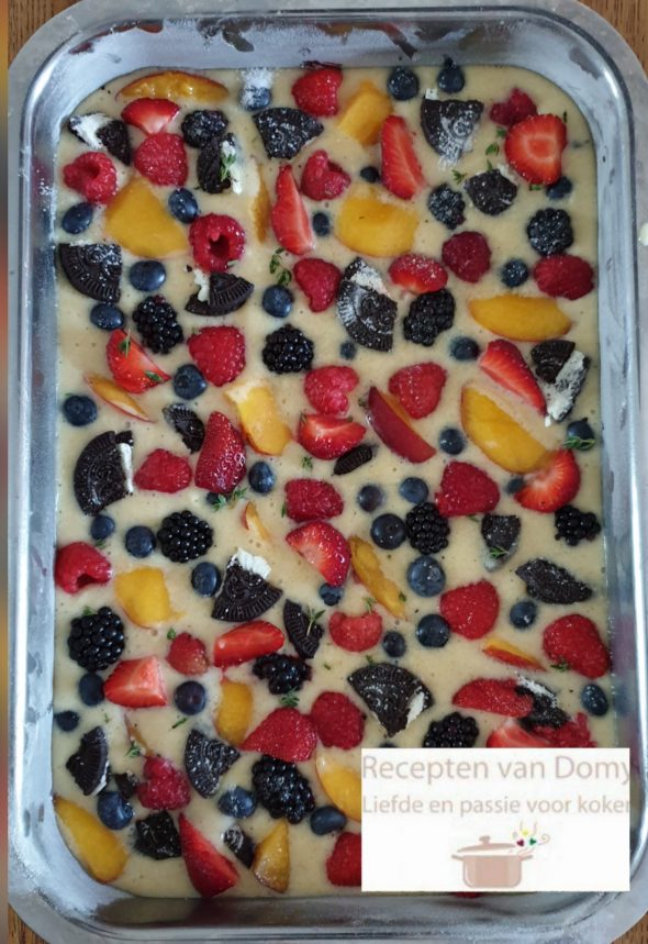 Verdeel de zomerfruits en de oreo koekjes op het beslag.