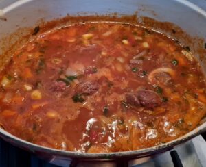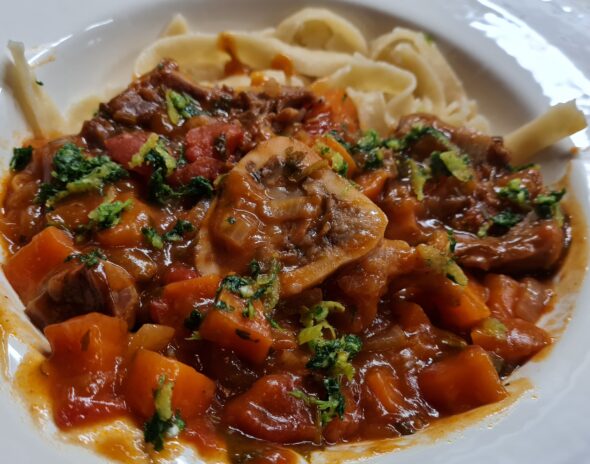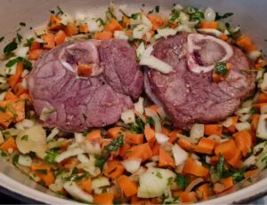 Het is een heerlijke stoof van kalfschenkels in een wijn en groenten saus.