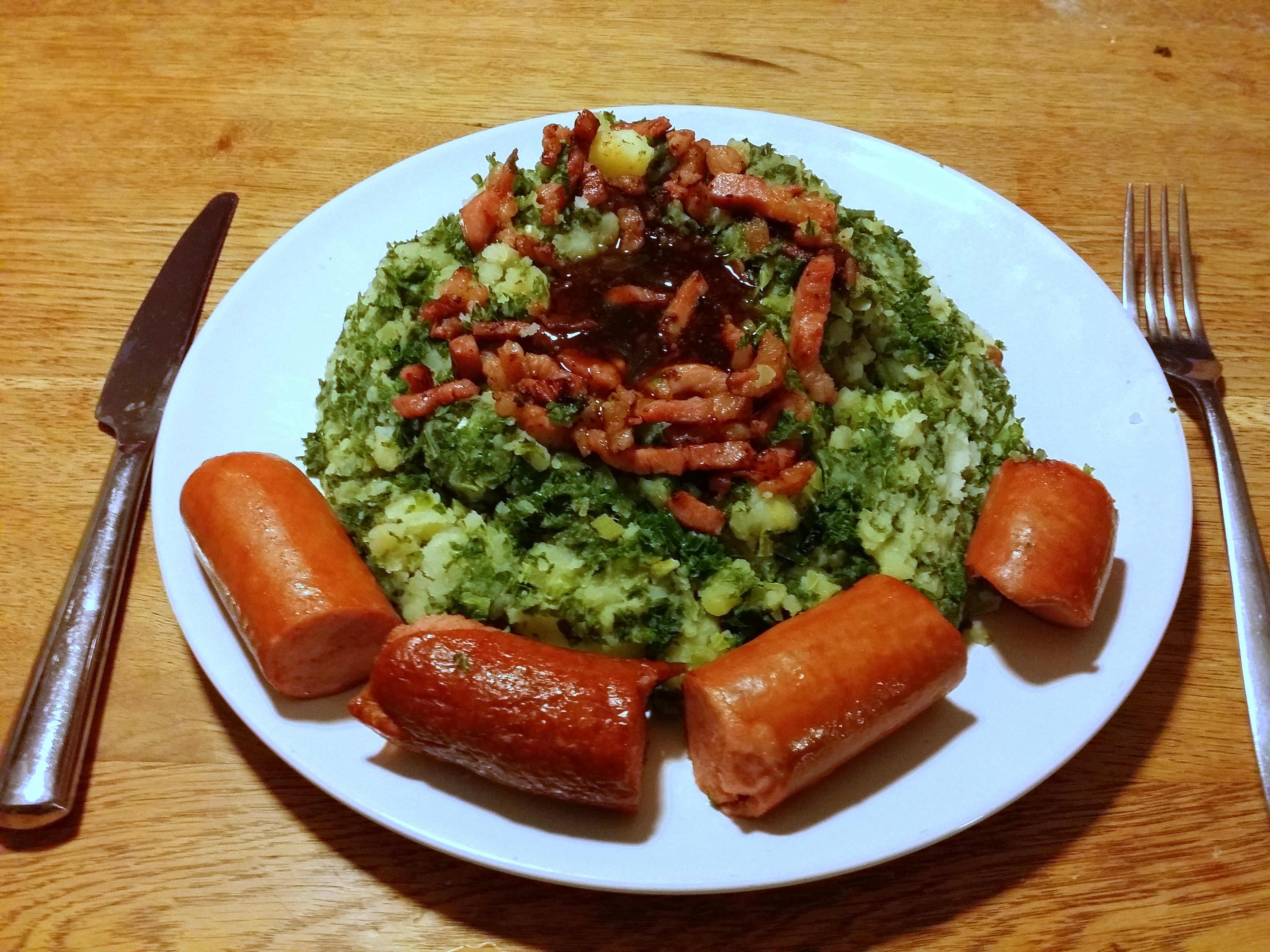 Stamp de boerenkool/aardappels fijn tot stamppot. Voeg de uitgelekte spekjes toe aan de boerenkool.