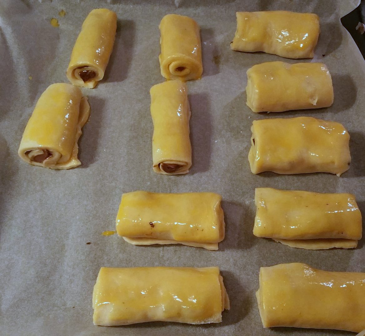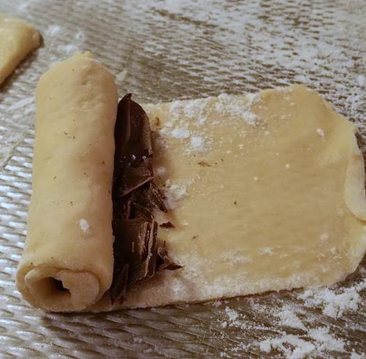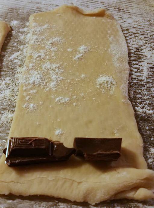 Leeg 2 stukjes chocolade erop en rol het deeg tot de middel van de reep.