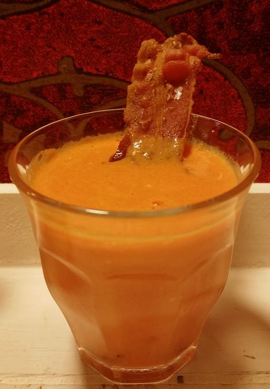 Serveer de soep in glaasjes met een ontbijtspek reepje als garnering.
