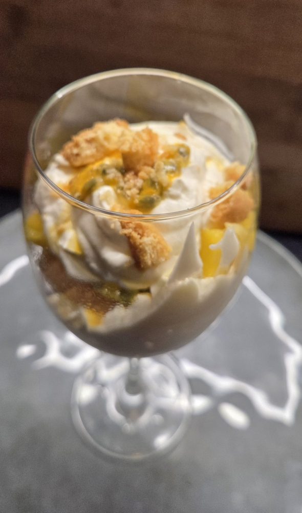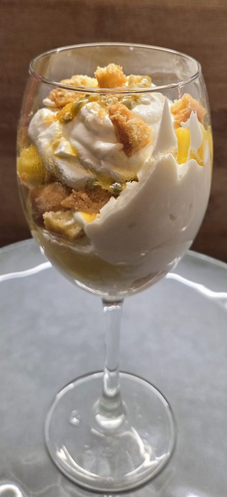 Lepel uit en verdeel de laatste passie vrucht en breek een cookie (1 voor de 4 glazen) bovenop.