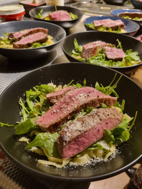 Leg een paar plakjes biefstuk erop en strooi wat grove zout eroverheen en nog wat parmezaanse kaas.