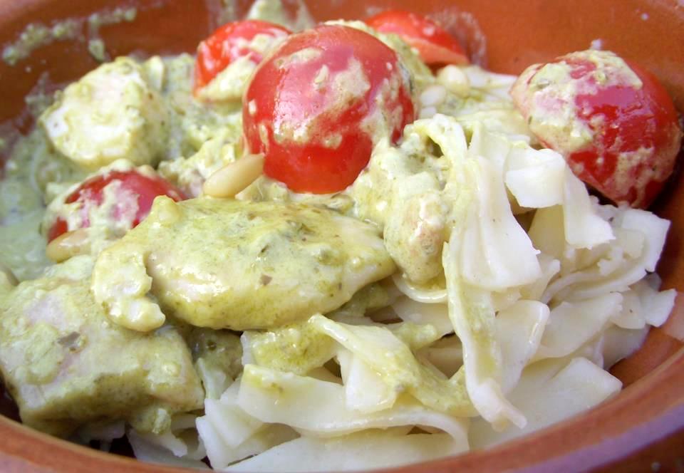 Voeg de pesto en de creme fraiche toe aan de kipfilet.