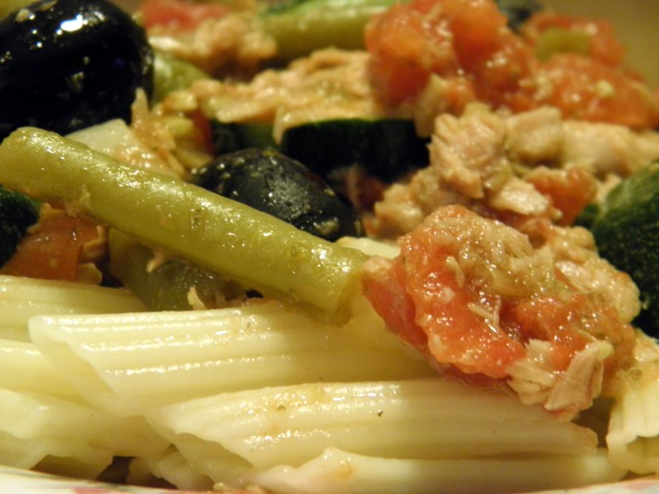 Voeg de tonijn en de sperziebonen toe en laat nog heel zacht 8 minuten koken.