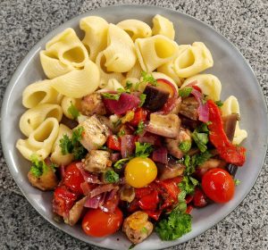 Pasta Caponata kan koud als salade maar ook warm gegeten worden.