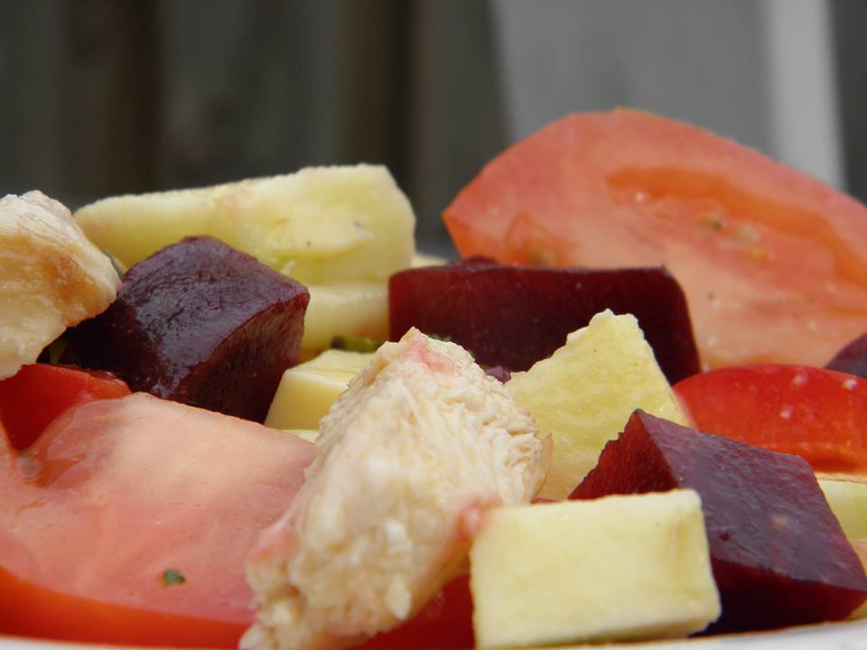 Om te voorkomen dat alle ingrediënten naar de kleur van de bieten verkleuren, voeg de bieten op het laatst moment in de salade.