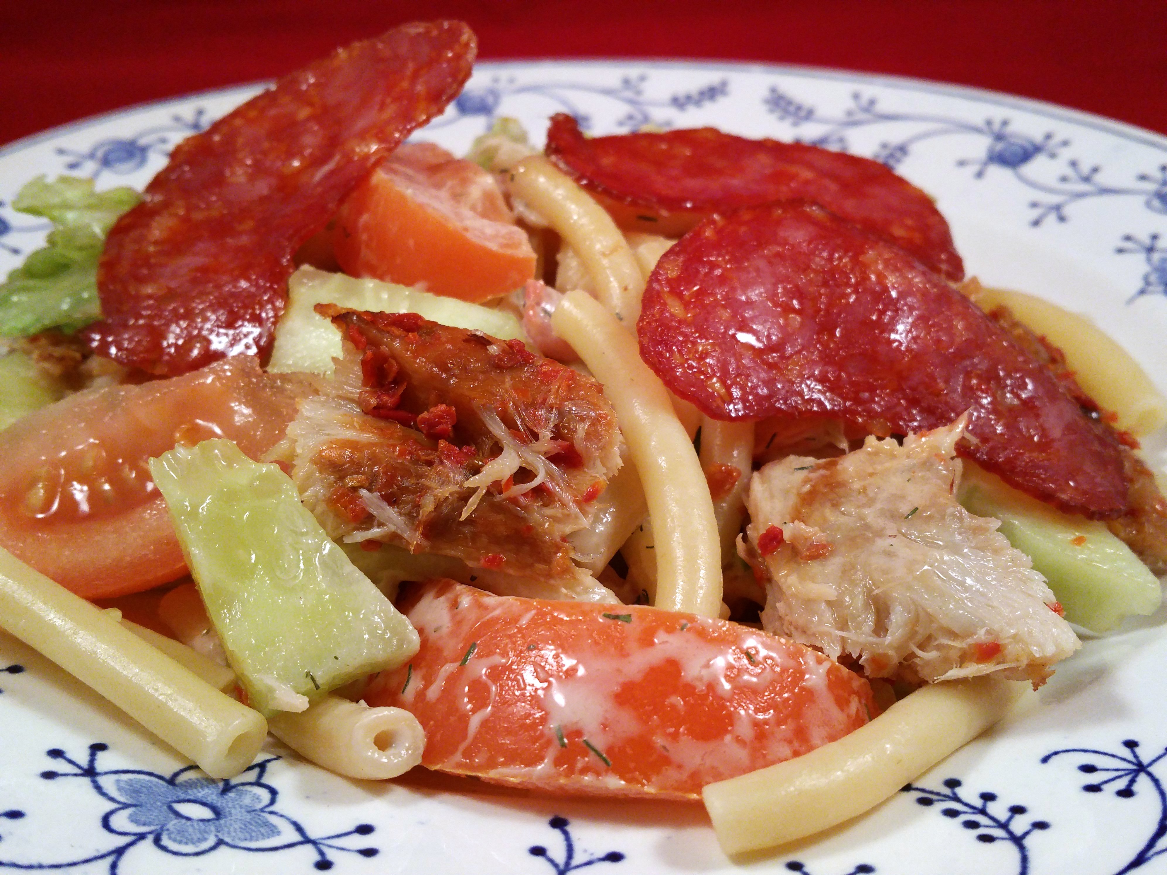 Meng samen de spekjes, de tomaten, de komkommer, de pasta, de makreel filets, de sla en de dressing.