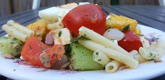 Pasta in een vergiet doen, omspoelen met koud water en uit laten lekken.Maak de dressing klaar.