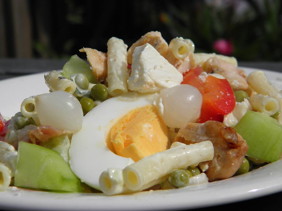 Meng nu alle ingrediënten en de dressing samen en zet de pastasalade een uur in de koelkast.