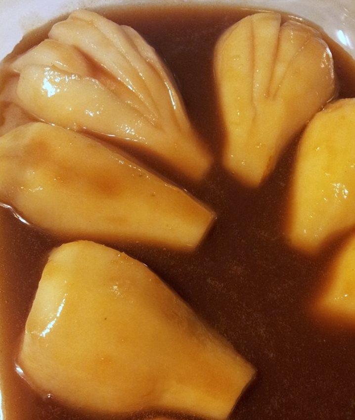 Leg de halve peren in een ovenschaal en giet de karamel saus eroverheen.