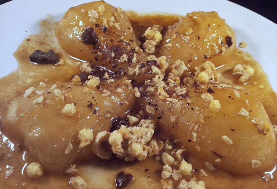 Leg de peren in borden, giet een beetje karamel saus erop en strooi wat cruesli erop.