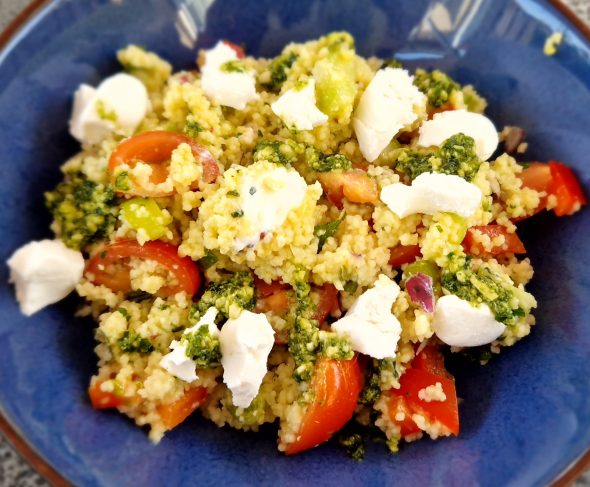 Heerlijke frisse, kruidige salade van couscous met pesto, tomaatjes, komkommer en geitenkaas.