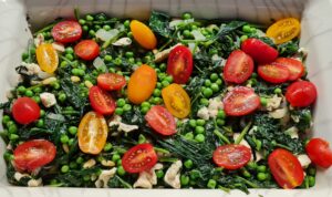 Voeg nu de doperwtjes en de tomaatjes toe en bak mee, 3 minuten.