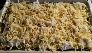 In een ovenschaal, verdeel de helft van het spinazie mengsel.Zet erop, naast elkaar, 4 lasagne vellen.