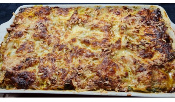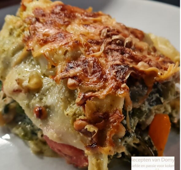 Heerlijke lasagne met romige groene pesto saus en groenten.