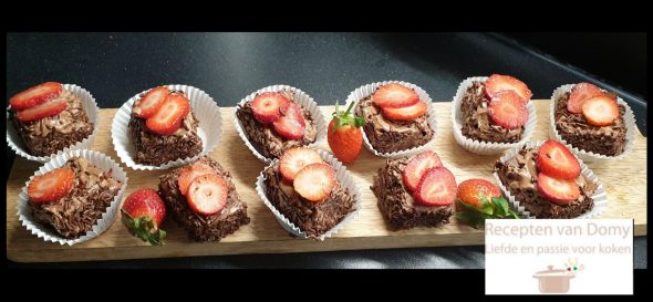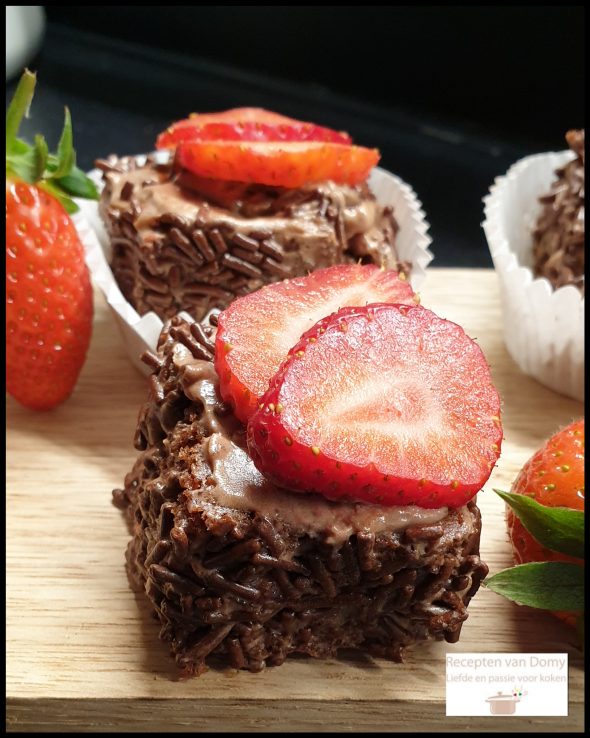 6. Zet de petit four op een bord, smeer een theelepel mousse erop en decoreer met wat hagelslag en 2 aardbeien plakjes erop.
