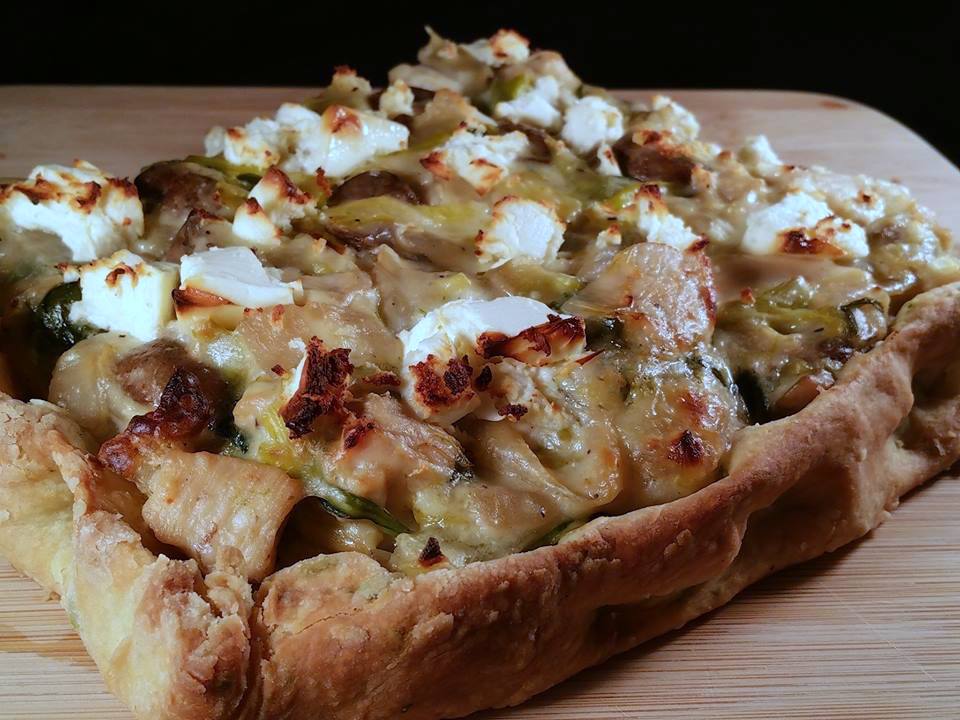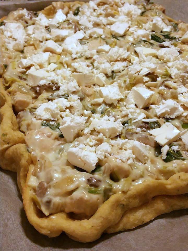 Verscheur de feta en verdeel hem over de vulling van de pizza.