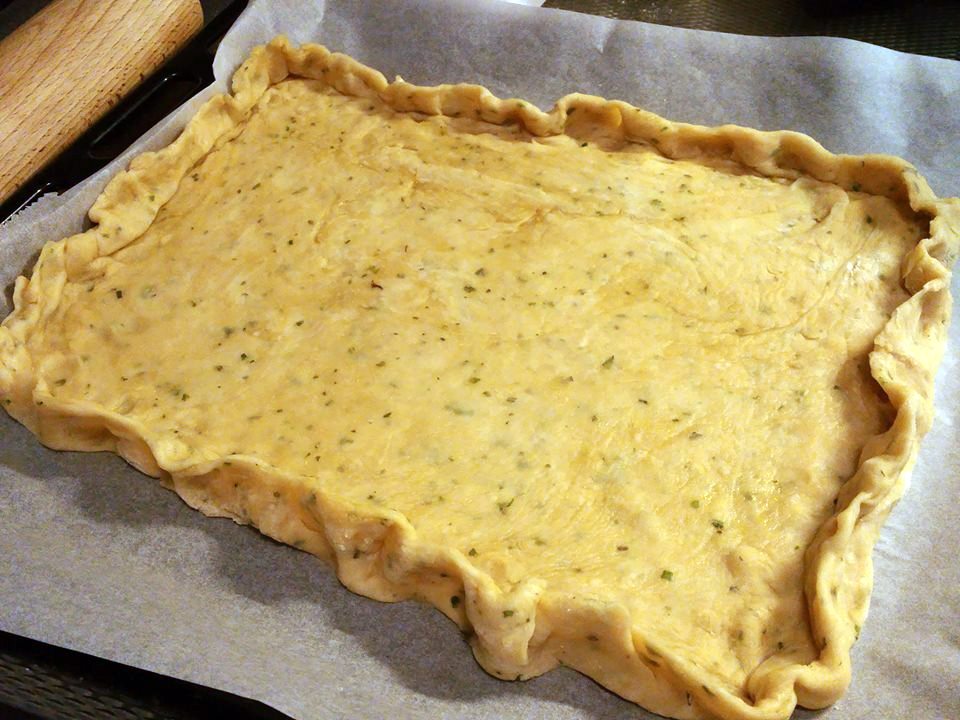 Rol het deeg uit en leeg hem op een ovenplaat, bedekt met bakpapier.