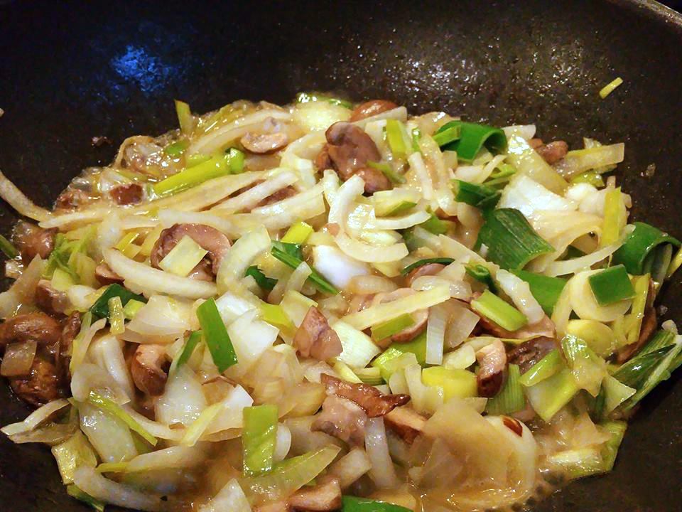 Snijd de champignons in schijven, de prei en de uien in ringen en de kipfilet in blokjes.