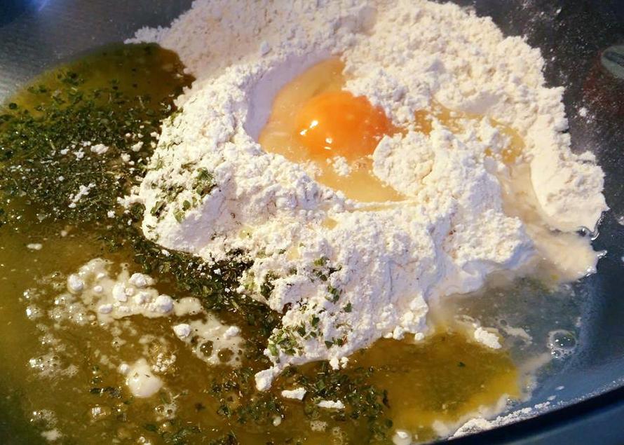 Meng de bloem met de bakpoeder, het ei, olijfolie en lauw water.