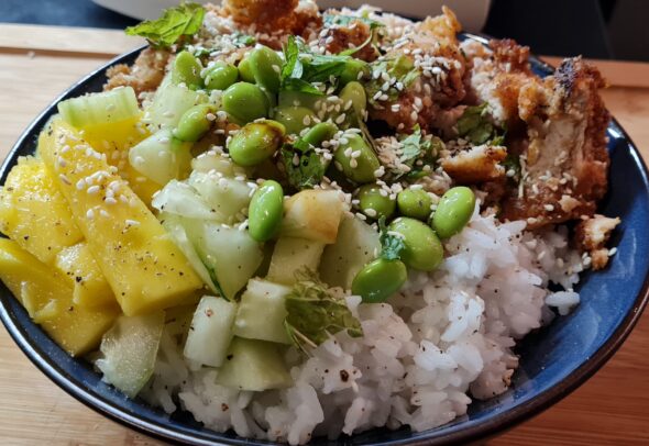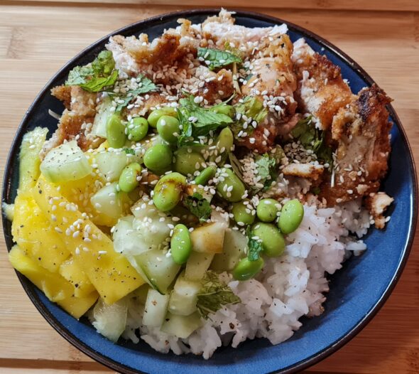 Heerlijk poke bowl met gepaneerde kipfilet reepjes.
