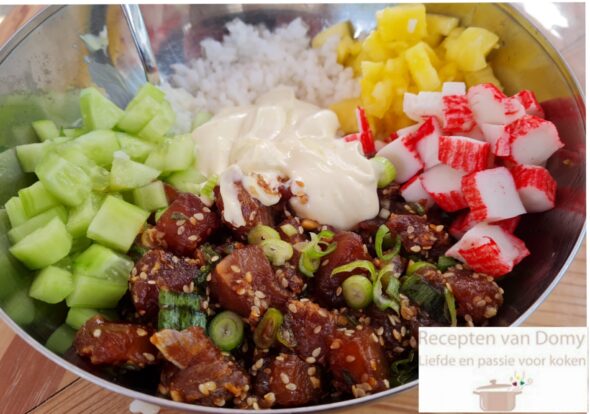 Verdeel de tonijn, de ananas, de krab en de komkommer erop.