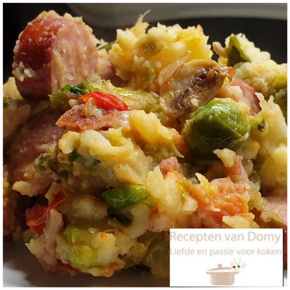 Bak erin de knoflook, de uien, de champignons, de paprika, de plakjes worst, de spekjes en de spruitjes tot de spruitjes beetgaar zijn.