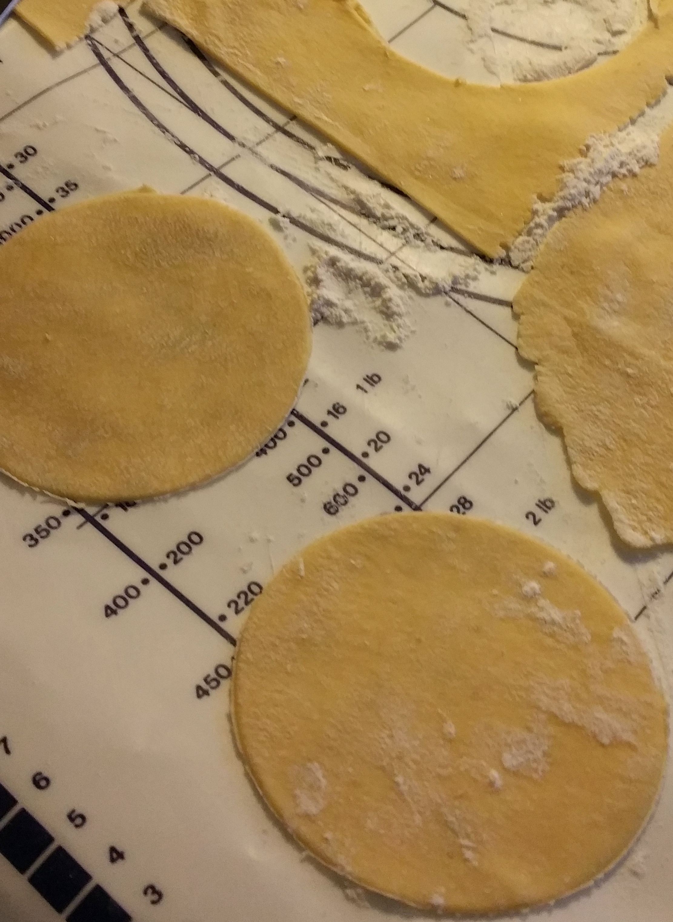 Rol het deeg heel dun uit en steek rondjes uit, 2 per raviole.