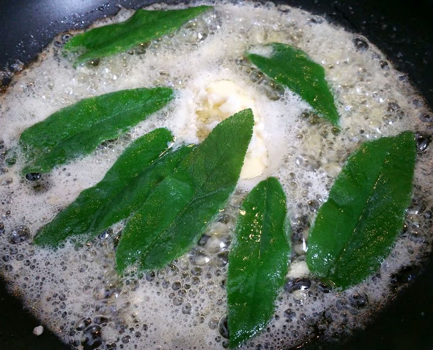 Voeg de blaadjes salie toe, de boter zal een beetje schuimen terwijl de salie knapperig wordt – ongeveer 30 sec –