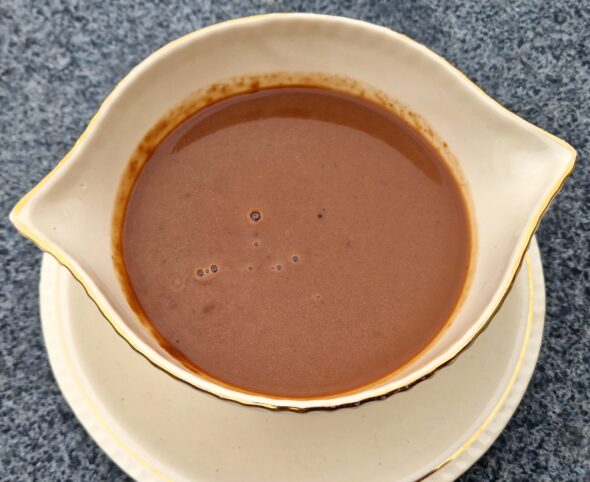 Als u de saus te dun vindt, maakt een papje in een kom van 1 eetlepel maizena vermengd met 1 eetlepel water.
