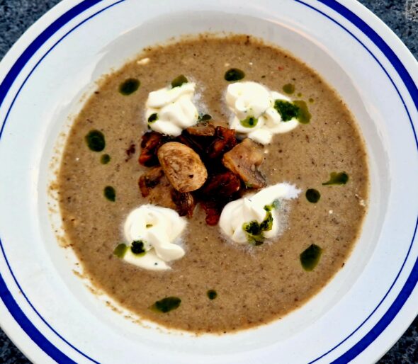 Serveer deze heerlijke soep met bijvoorbeeld, ham reepjes, bacon jam, spekjes, soepentengels of croutons, hartige slagroom en gebakken champignons.