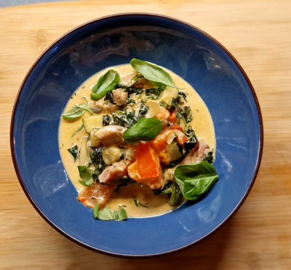 Vol groenten, heerlijke gekruide kipfilets blokjes in een romige saus.