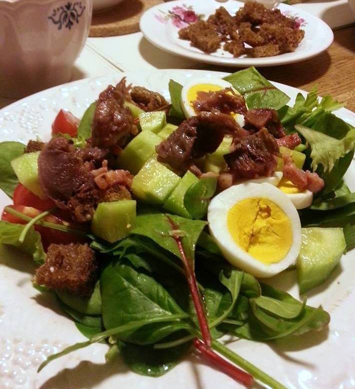 Hier heb ik het recept een beetje aangepast. ik heb komkommer en ei toegevoegd.De maagjes op een zacht vuur bakken in het eendenvet.