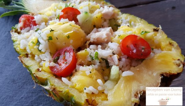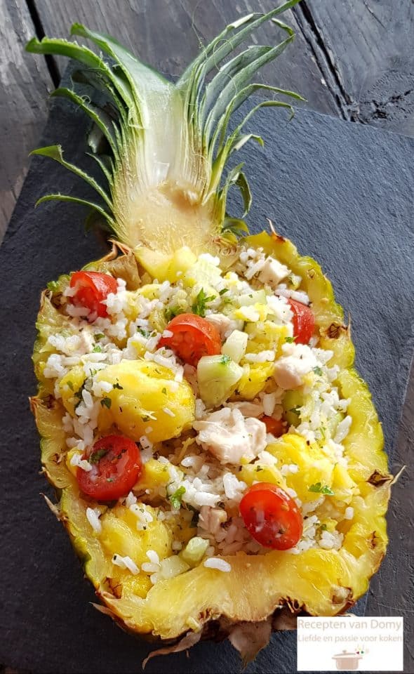 Meng de ananas met de rijst, de tomaatjes, de kip, de kokommer, de citroen dressing en de kruiden.