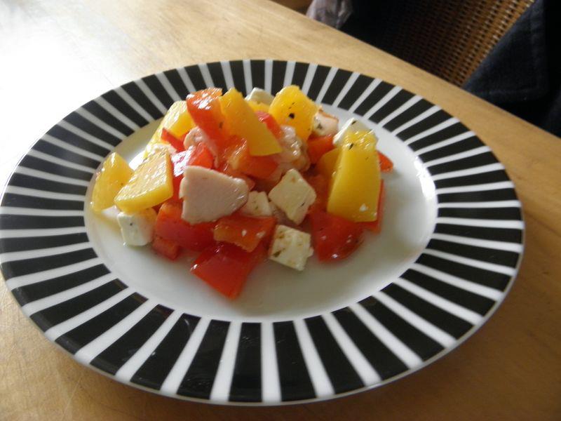 Snijd de perziken, de kipfilet, de feta kaas en de paprika in kleine blokjes.
