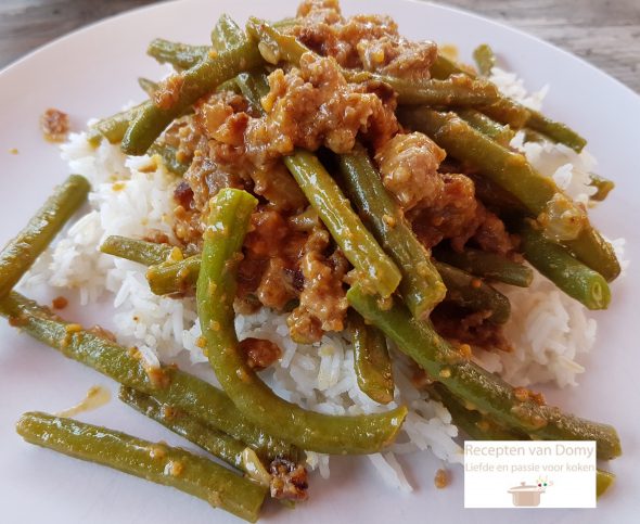 Voeg de sperziebonen toe, zet de deksel op dw wok en laat nog 5 minuten zacht pruttelen.