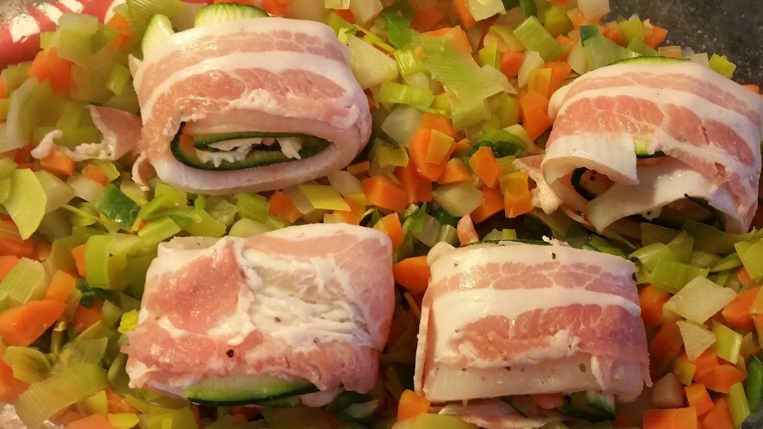 Rol nu 2 bacon plakjes om het rolletje.