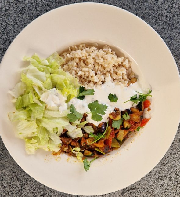 Het is een koolhydraatarm recept maar heb ik een serveer lepel volkoren rijst erbij gedaan, omdat we het lekker vinden