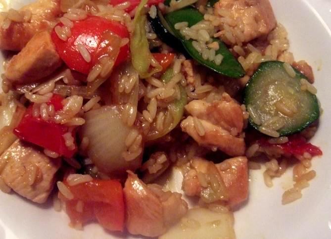 Bak in een wok met wokolie, de kipfilet, de ui en het teentje knoflook.
