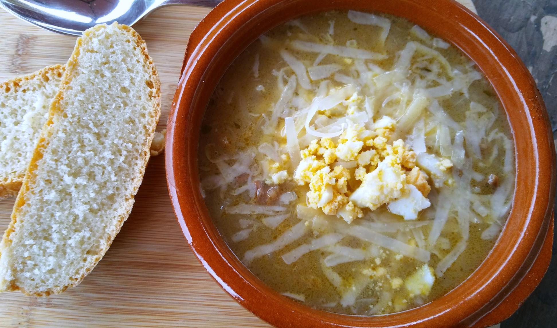 Serveer de soep met geraspte kaas, eieren en naast verse gebakken brood.