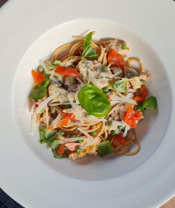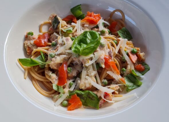 Heerlijk recept met gerookte zalm, champignons, courgette, doperwtjes in een romige citroen saus.