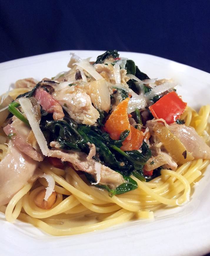 Snijd het vlees van de kippenbouten en voeg het vlees aan het spinazie mengsel toe.