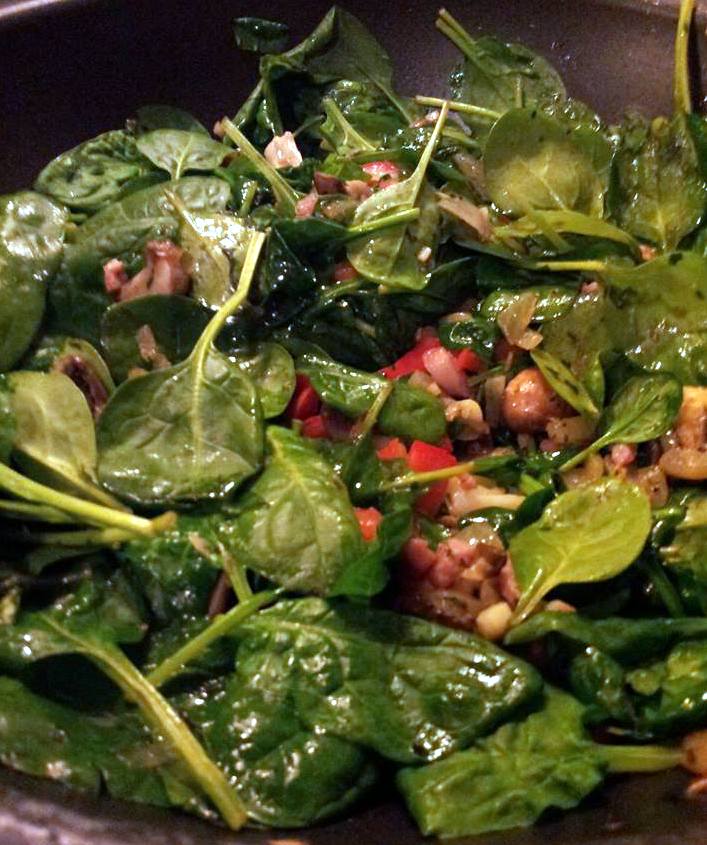 Voeg dan de andere helft van de spinazie en wok het tot het ook geslonken is.